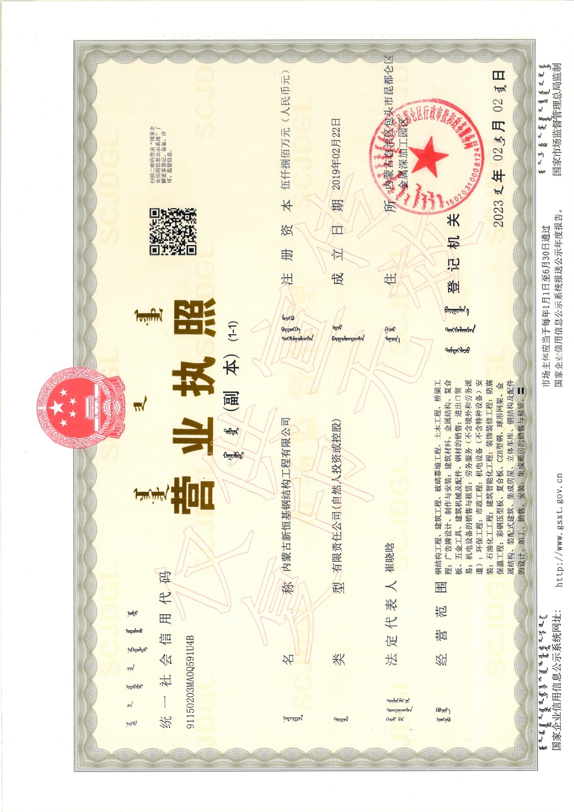 内蒙古新恒基钢结构工程有限公司成立于2019 年2月2日,公司坐落于内蒙古自治区包头市金属深加工工业园区,注册资金5800万元,是一家专注钢结构设计、研发,制作,施工与一体化建筑工程企业。以钢结构公共建筑,装配式钢结构住宅,工业厂房,化工设备平台科技,多高层框架,大跨度空间结构结构桥梁钢结构及钢结构围护体系的绿色建筑产品。