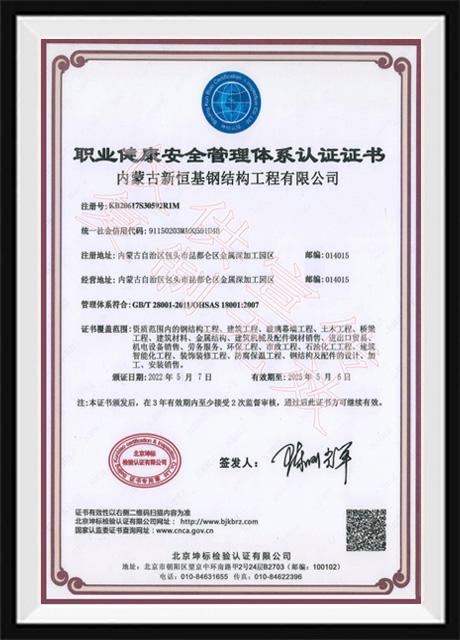 职业健康安全管理体系认证证书