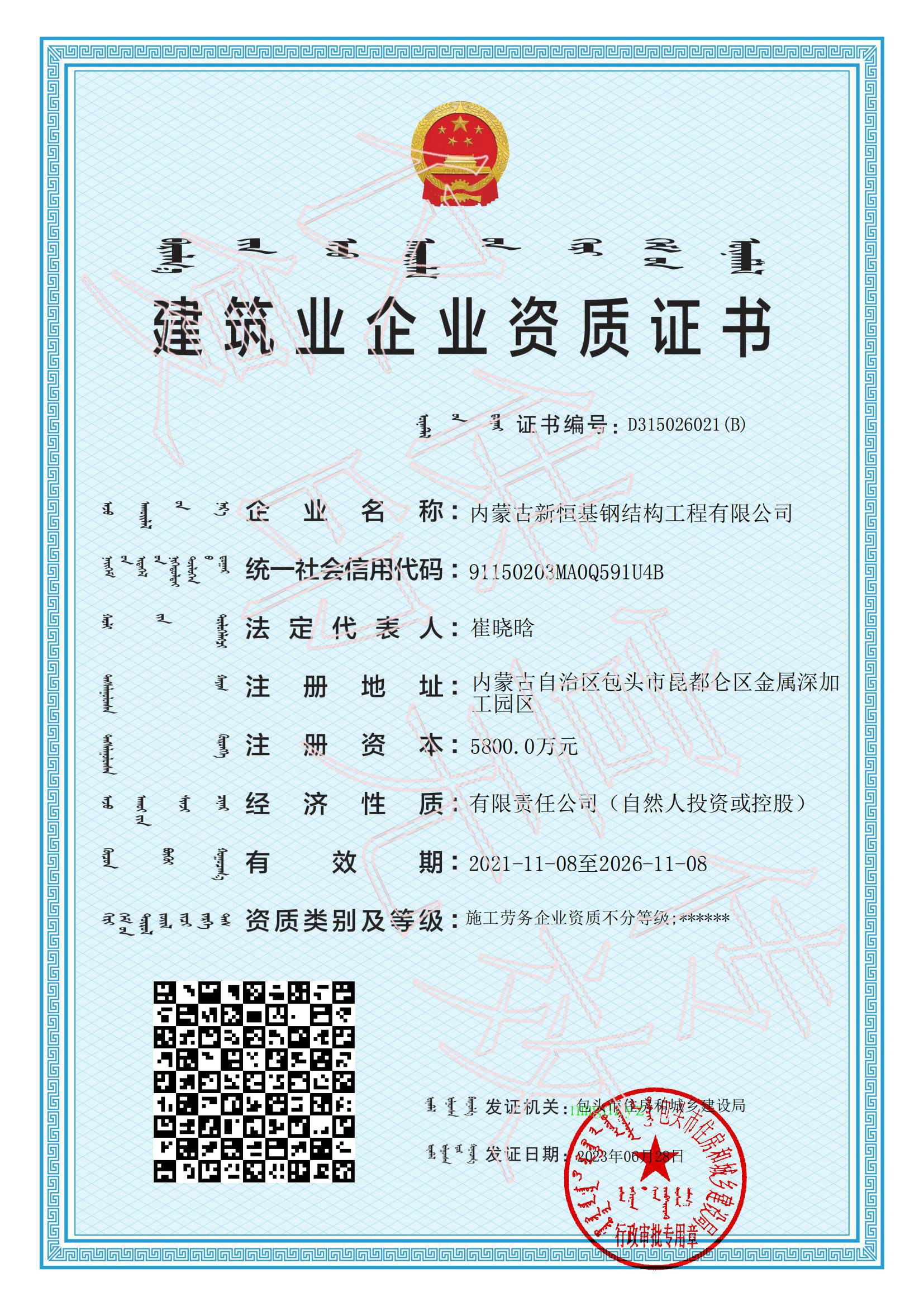 建筑三级、钢结构三级、装饰装修二级